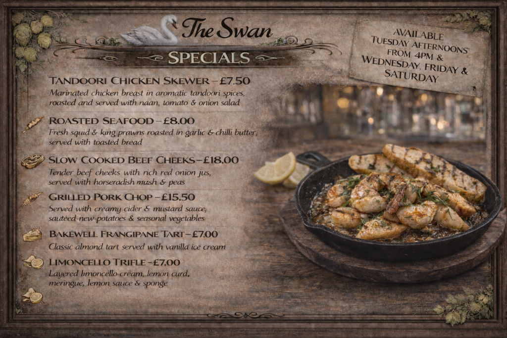 The Swan is the perfect place to relax and unwind in front of the cosy open fires in a warm and friendly atmosphere and enjoy our extensive selection of wines, beers and ales.